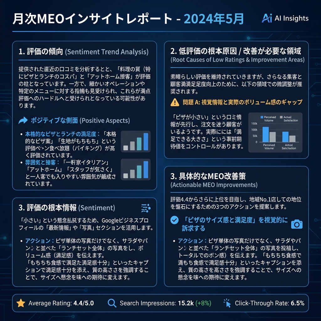「集客できない理由」はデータの中に隠れています。月次レポートでは、口コミのネガティブ要素をAIが根本原因まで特定し、写真投稿による期待値コントロールなど、視覚情報を用いた確実な改善策を提案します。